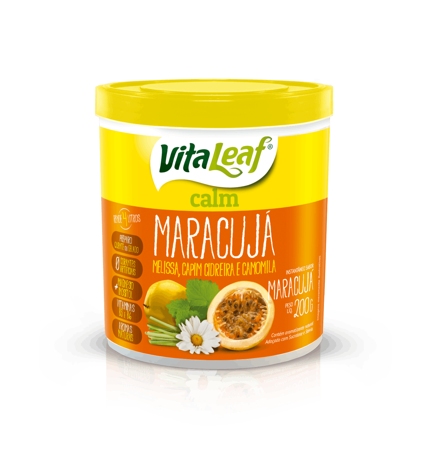 Calm Maracujá Vita Leaf possui em sua formulação um mix de extratos vegetais solúveis: (Melissa, Capim Cidreira e Camomila) que em conjunto atuam como calmante e relaxante natural, também tem extrato de maracujá que além de saborosa cria uma sinergia com a bebida potencializando seus efeitos. Contêm ainda Magnésio, Inositol e Vitamina B3 e B6. Pó instantâneo, sem adição de açúcar, com aroma e corante naturais. Pode ser consumido quente ou gelado.